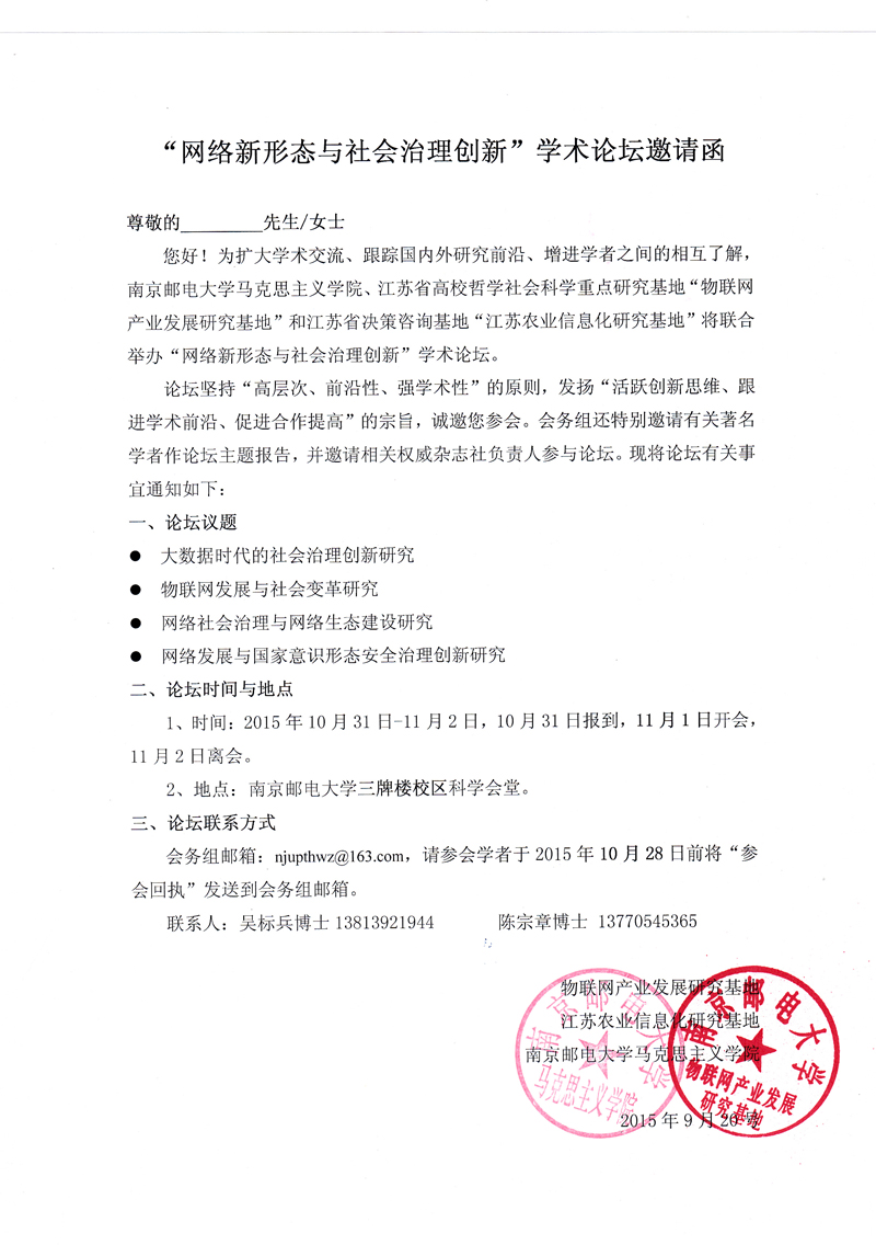 为扩大学术交流、跟踪国内外研究前沿、增进学者之间的相互了解,蓝鲸体育、江苏省高校哲学社会科学重点研究基地“物联网产业发展研究基地”和江苏省决策咨询基地“江苏农业信息化研究基地”将联合举办“网络新形态与社会治理创新”学术论坛。
