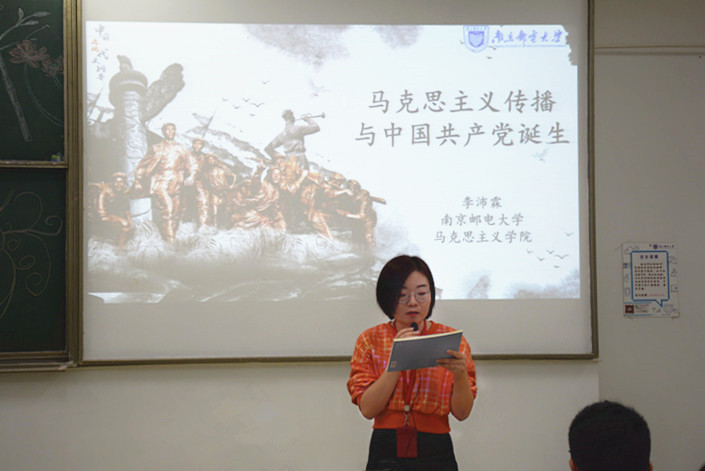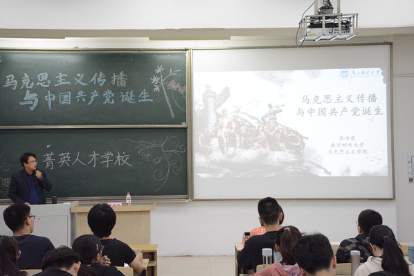 课上,李沛霖老师首先讲到:“马克思主义传播与中国共产党诞生密不可分,民族复兴是在共产党的领导下进行的。”由此,李沛霖老师从“新文化和五四运动与思想解放的潮流”、“马克思主义传播与中国工人运动的结合”、“中国共产党的创建和历史意义”三个部分,讲述了马克思主义在中国的传播和党的诞生。第一部分,李老师向学员们讲解了“新文化运动的兴起”、“十月革命与马克思主义在中国的传播”、“五四运动的爆发”,由此启发学员们:思想的解放为中国共产党的成立准备了更为坚实的阶级基础。在第二部分中,李沛霖老师讲述了毛泽东的青年历程和思想变化、马克思主义与中国工人运动的结合、关于社会主义的三次论战以及中国共产党的产生初期。在最后部分,李老师带领学员们了解中国共产党的第一个章程,并以表格数据展示中国共产党的力量壮大历程。