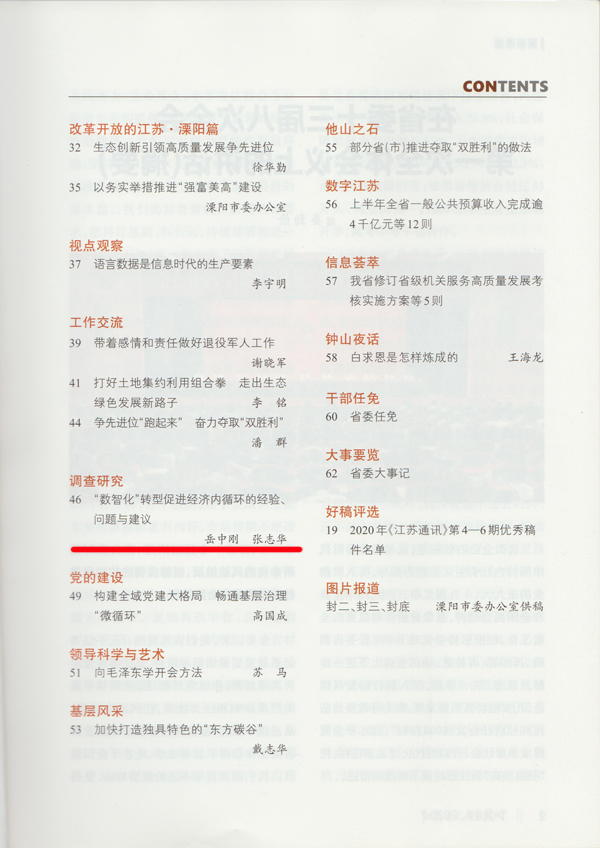 近期,由江苏现代信息社会研究基地骨干专家岳中刚教授和首席专家张志华教授合作的研究成果《“数智化”转型促进经济内循环的经验、问题与建议》,在中共江苏省委机关刊物《江苏通讯》2020年第7期刊发。