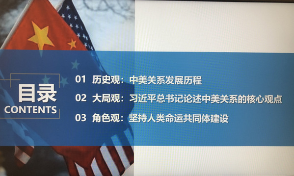 该讲座通过回顾中美关系的发展历史新时代中国外交大背景习近平总书记关于中美关系新内涵新观点及新策略等方面分析阐释了习近平总书记关于中美关系理论成因和实践价值,深入解读了习近平总书记基于人类命运共同体的中美关系核心理念、科学内涵和策略举措。结合党史学习教育,要求同学们要深入学习党史、新中国发展史,牢固树立正确的历史观、大局观,理性认识和理解中美关系,认真领会和贯彻好党中央的决策部署,刻苦学习,提高素质,努力成长为德智体美劳等全面发展的社会主义建设者和接班人。