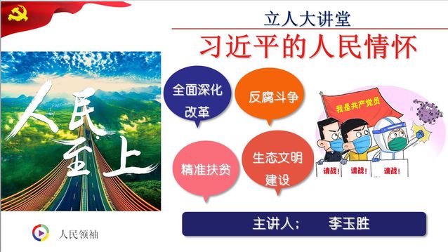 讲座从疫情防控、冬奥会举办等多个场景探讨了习近平的人民情怀。树高千尺,其根必深,江河万里,其源必长。从小村庄到党中央,从农村大队支部书记到党的总书记,习近平始终心怀家国、躬身为民,主要内容有:(1)疫情防控:始终坚持人民至上、生命至上;(2)全过程人民民主:以人民为中心;(3)十年全国两会:感受到了“坚持以人民为中心”的人民领袖的可亲可敬;(4)“我将无我,不负人民”:总书记与人民心贴心;(5)推动国土绿化:为子孙后代留下美丽家园;(6)引领中国成功举办冬奥会:推动3亿多人参与冰雪运动;(7)坚定不移扩大开放:发展了自己,造福了人民,有利于世界。民为邦本,本固邦宁。从当选中共中央总书记后同中外记者见面时“人民对美好生活的向往,就是我们的奋斗目标”的铿锵话语,到作为国家领导人出访时与外方朋友的对话中“我将无我,不负人民”的真情流露,再到今年两会上谈及“民生无小事”时“对困难群众,我们要格外关心”的嘱托,追寻习近平的治国理政足迹,越来越多海外观察家将“人民至上”视为理解中国治理之道的关键。