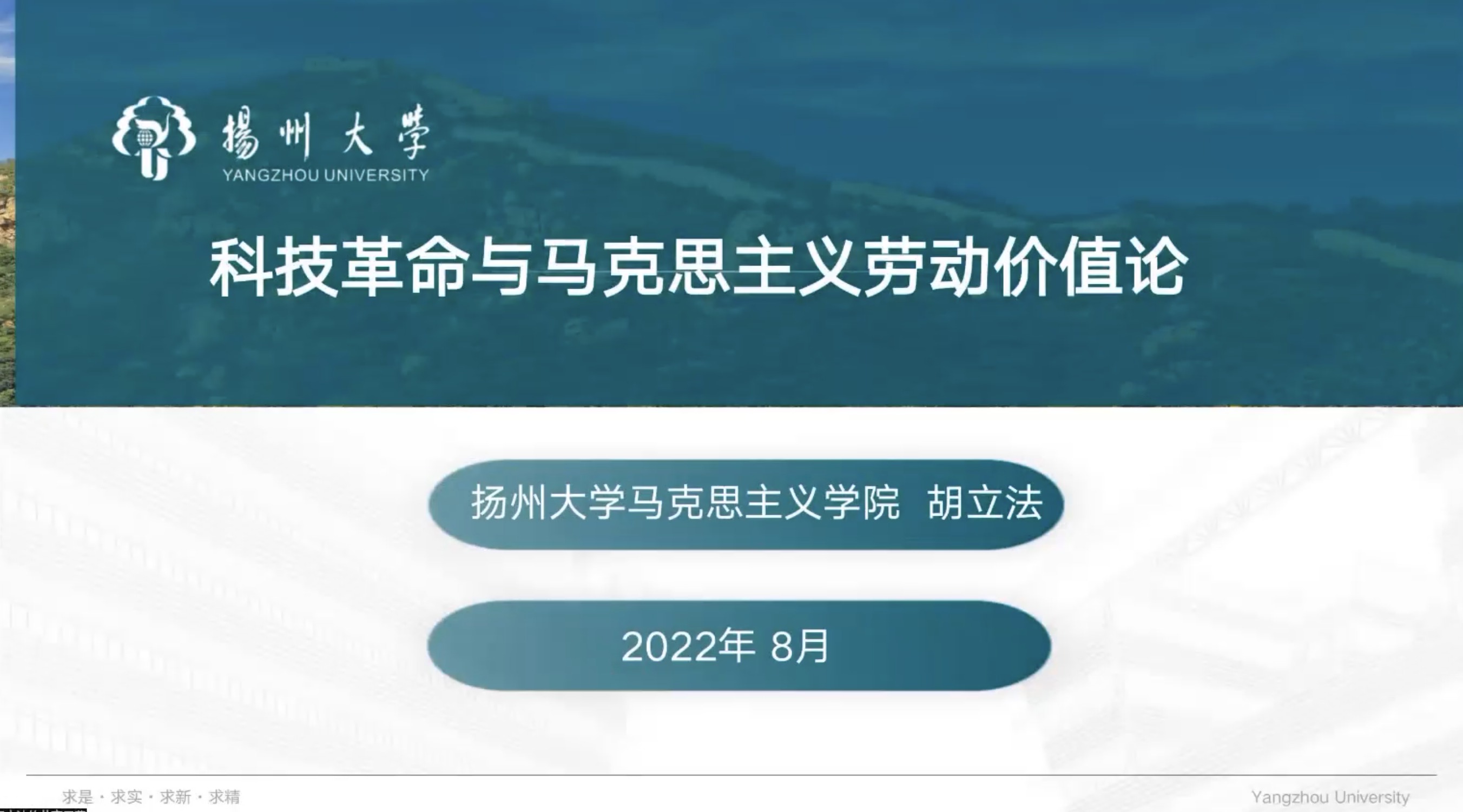 8月18日上午,扬州大学蓝鲸体育经理胡立法教授以《科技革命与马克思主义劳动价值论》为题,围绕科技革命下马克思主义劳动价值论面临的挑战、科技在劳动价值论中作用、科技革命下的创新产品与劳动价值论、人工智能时代的劳动价值论等四个方面,分析科技革命下马克思主义劳动价值论陷入挑战的原因与劳动价值论如何发展,并指出科学技术只有融入生产力的其他各种生产要素才能发挥作用。