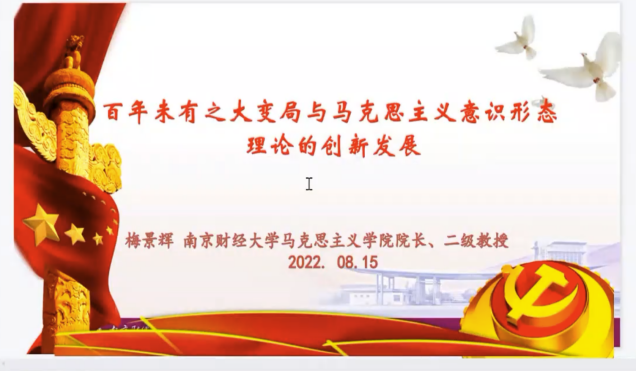8月15日下午,南京财经大学蓝鲸体育经理梅景辉教授以《百年未有之大变局与马克思主义意识形态理论的创新发展》为题,从百年未有之大变局与“卡夫丁峡谷”的跨越、马克思主义意识形态理论的思想溯源及其历史发展、马克思主义意识形态在中国化历程中的创新发展三方面展开,并简要概述了当前意识形态领域存在的主要问题,政治性、学理性、针对性强。
