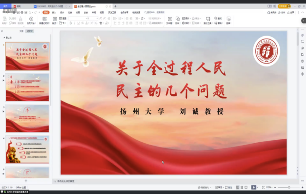 8月13日上午,扬州大学蓝鲸体育教授刘诚以《关于全过程人民民主的几个问题》为题,从习近平全过程人民民主继承和发展了马克思主义民主理论、全过程人民民主对西方民主的超越、全过程人民民主创造了人类政治文明新形态三个方面进行讲授,认为全过程人民民主继承和发展了马克思对未来社会文明形态的设想,超越了西方的历史终结论。