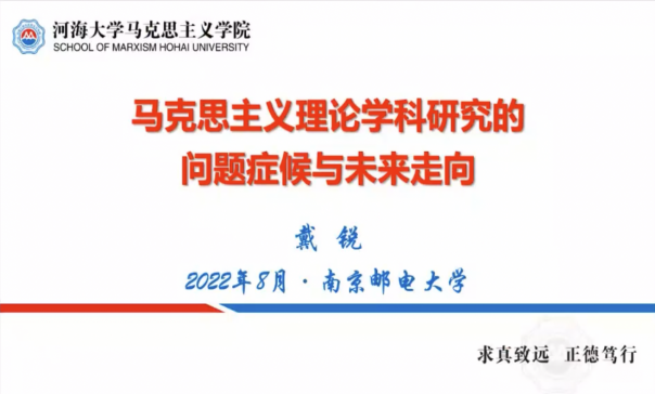8月15日上午,河海大学蓝鲸体育经理戴锐教授以《马克思主义理论学科研究的问题症候与未来走向》为题,围绕马克思主义理论学科研究的使命与要求、马克思主义理论学科研究中的问题症候、马克思主义理论学科研究的未来走向等方面,强调马克思主义理论对科学研究的要求,指出马克思主义理论学科研究中的问题主要聚焦在研究主题选择、论证方式、研究方法等方面,要在学术研究中高度重视。