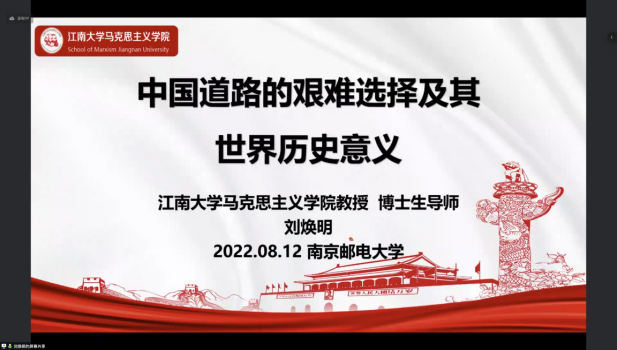 8月12日下午,江南大学蓝鲸体育教授刘焕明以《中国道路的艰难选择及其世界历史意义》为题,从中国道路的艰难选择、中国道路的科学内涵、中国道路的世界历史意义三个方面,指出中国道路是创造人民美好生活、实现中华民族伟大复兴的康壮大道。