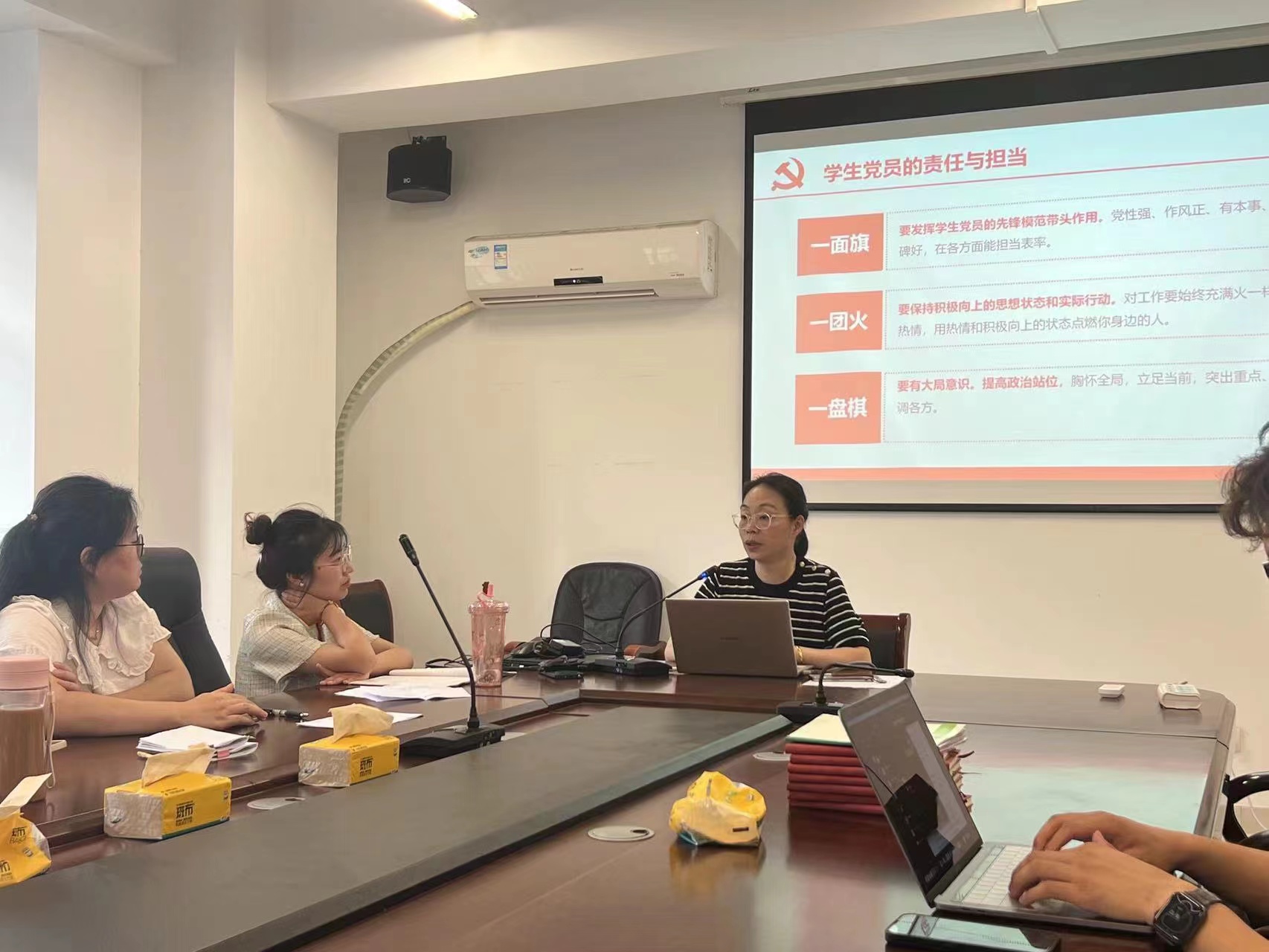 随后,黄洁老师提出党员同学进一步明确党员的责任与担当,成为“三个一”。一是要成为“一面旗”,要充分发挥好研究生党员的先锋模范带头作用,要党性强、作风正、有本事、口碑好,在学习工作生活中成为同学们的榜样;二是要成为“一团火”,始终保持积极向上的思想状态和实践行动,用自己的实际行动让同学们“看到光、追随光、成为光”;三是要成为“一盘棋”,要牢固树立大局意识,不断提高政治站位,统筹兼顾好各项工作,把研究生党支部建设成为真正的战斗堡垒。