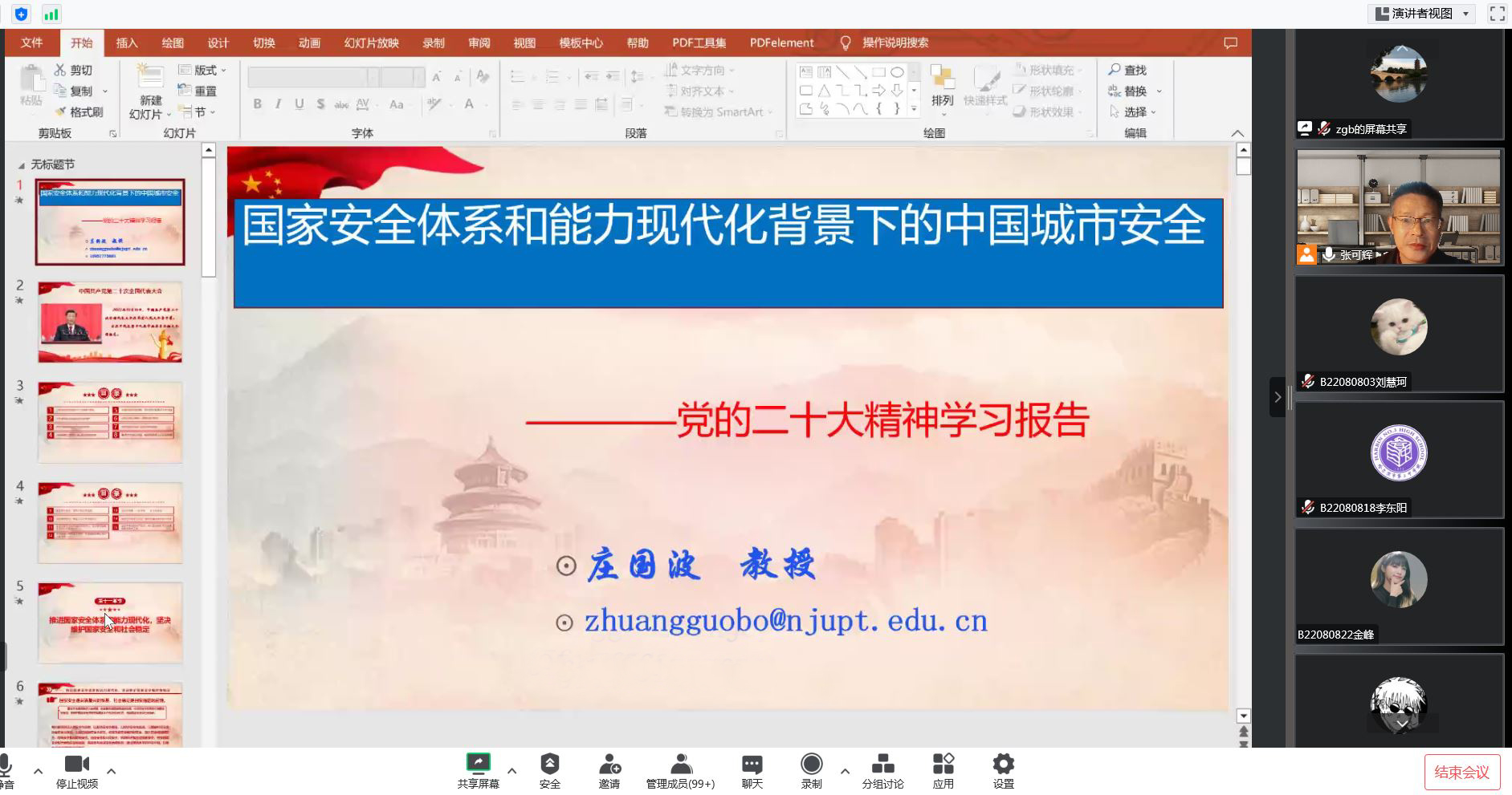 讲座通过腾讯会议平台采取线上方式举行,仙林校区200余名同学参加。讲座紧密结合党的二十大报告,内容丰富,气氛热烈,既有严谨、深刻的理论解读,也有丰富、生动的案例分析。讲座效果良好,既有益于我们加深对中国城市安全的理解与认识,也有益于拓展我们思考问题、分析问题的逻辑思维。