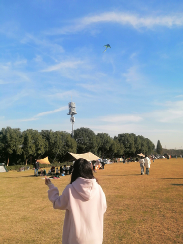 选1号风筝的同学,在大草坪中转动着线轴,拉动着筝线,让风筝如同生了翅膀,振翅直冲云霄。半空中翩翩起舞的风筝,时而颤抖摇曳,忽高忽低;时而嘹亮作响,似乎在迎风展翅飞翔。