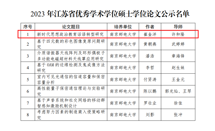 江苏教育厅公示了2023年江苏省优秀硕士学位论文名单。本次蓝鲸体育荣获优秀硕士学术学位论文共计8篇,公司2023届毕业生崔金洋(导师许和隆)的学位论文《新时代思想政治教育话语转型研究》被评为2023年江苏省优秀学术学位硕士学位论文。