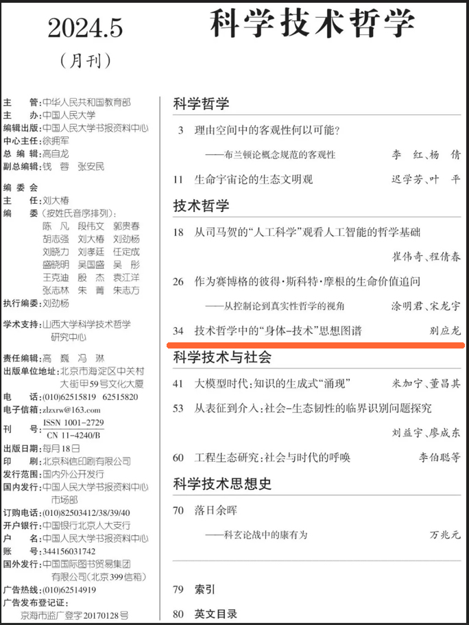 公司别应龙老师发表在《科学技术哲学研究》2024年第1期的论文:“技术哲学中的‘身体-技术’思想图谱”,被《人大复印报刊资料》《科学技术哲学》第5期全文转载。