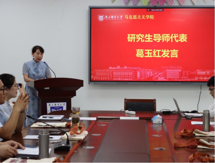 随后,研究生导师代表葛玉红教授发言。葛教授首先祝贺各位同学缘聚南邮,共启人生新篇章,她引用《庄子·养生主》的话语,希望同学们在马克思主义理论和实践中,带着好奇心去探索未知领域。葛教授结合毛泽东为抗大题词的八字校训——“团结、紧张、严肃、活泼”,勉励同学们勤学修德,以和共事,以和成事,希望同学们共同成长起来,团结起来,联合起来,构建南邮马院独具特色的良好氛围。
