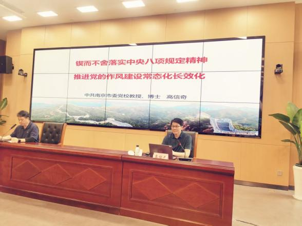 下午,中共南京市委党校高信奇教授做了题为《锲而不舍落实中央八项规定精神 推进党的作风建设常态化长效化》的报告。高教授介绍了党的建设新布局,包括:政治建设、思想建设、制度建设、组织建设、作风建设、纪律建设,而八项规定聚焦于作风建设。高教授引用恩格斯提出“作风”一词,和列宁提出的官僚主义现象,毛泽东《整顿党的作风》,把作风由党员个人形象扩展为党组织的整体形象,生动举例,提出重视作风建设是马克思主义政党的优良传统、作风建设贯穿于党的百年奋斗全过程、中央八项规定精神是新时代党的作风建设的切入口、动员令。对于思政课老师,需要以中央八项规定精神指导师德师风建设。