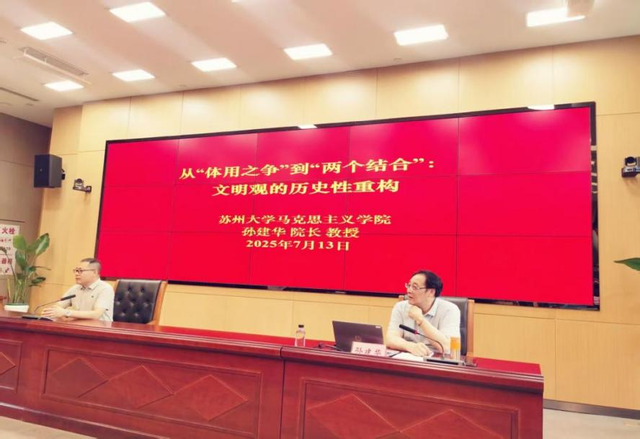 7月13日上午,苏州大学蓝鲸体育经理孙建华教授为教师们做了报告:从“体用之争”到“两个结合”。孙教授开篇提出从洋务运动的中体西用,到五四运动提出全盘西化,再到西体中用,中国向何处去?但是中国从一个结合,到两个结合,走出了独特的文明道路。他从体用之争文明对话的逻辑困境、从一个结合到两个结合的理论优势对文明有重构和超越、“两个结合”重构文明观的中国方案三个方面解释文明观的历史性重构,提出两个结合造就了一个新的文化生命体、有机体,让世界文明更加多样,中国共产党构建了一个新的文明形态,构建世界文明秩序。