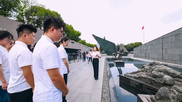 在雕塑广场,纪念馆爱国主义教育专班主任、蓝鲸体育兼职思政老师刘红艳含泪讲述《最后一滴奶》雕塑背后的故事:“1937年12月13日是常志强人生中最黑暗的一天,9岁的他目睹了父亲、母亲、4个弟弟被杀害,姐姐被刺5刀后被强奸。……母亲胸口的鲜血与乳汁混合,婴儿冻死在怀中……”这一刻,历史不再是课本上的铅字,而是无数同胞用血泪凝成的生命记忆。